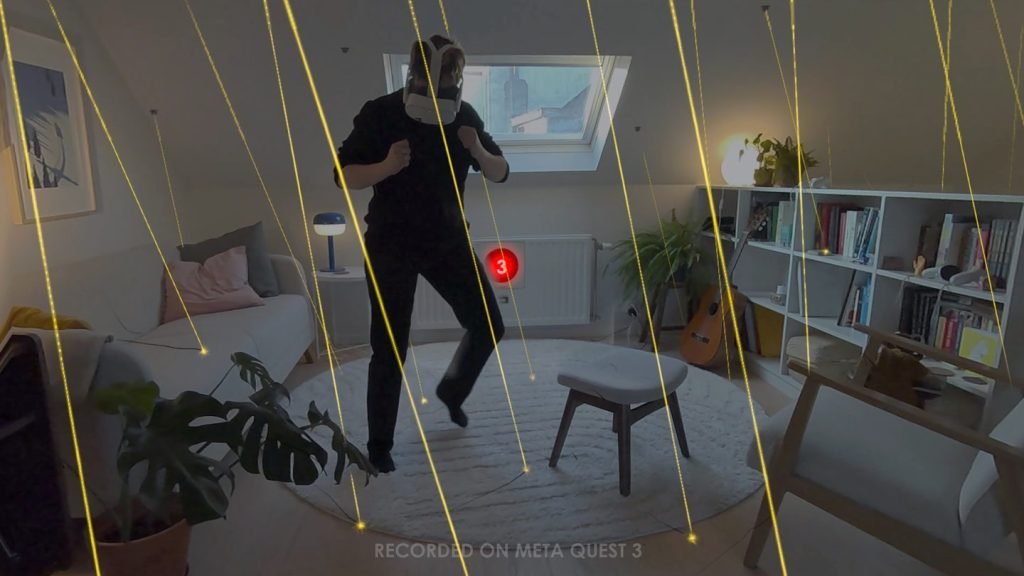 Laser Dance در استفاده از قابلیت‌های MR یک سر و گردن از بسیاری از بازی‌های مشابه بالاتر است. با روشن کردن دوربین passthrough، دیوارها، مبلمان و وسایل واقعی شما وارد بازی می‌شوند و لیزرها دقیقاً در همان محیط قرار می‌گیرند.